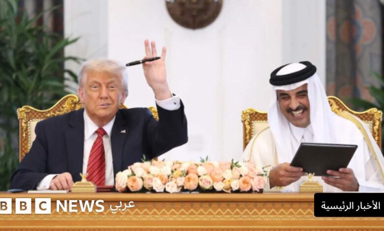 التعليق على الصورة، الرئيس الأمريكي ترامب وأمير قطر تميم بن حمد آل ثاني – الدوحة في 14 مايو/أيار 2025