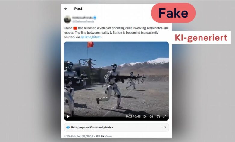 الادعاء: نشرت الصين مقطع فيديو لتدريبات إطلاق نار باستخدام روبوتات تشبه روبوتات تيرميناتور، حسبما ورد في منشور لى X تمت مشاهدته 375 ألف مرة. وورد في منشور آخر بأن للصين “أكثر من 10 آلاف جندي آلي في الخدمة، مما سيقلل من الخسائر البشرية إذا اندلعت حرب بين الصين وتايوان في عام 2027”. ووصفت منشورات أخرى الفيديو بأنه “اختبار إطلاق نار من Unitree Robotics”، بما في ذلك منشور على X حصل على أكثر من 1.5 مليون مشاهدة. كما تم نشر الفيديو مع ادعاءات مماثلة بالعديد من اللغات الأخرى، بما في ذلك العربية والفرنسية والروسية والإسبانية والتركية والبرتغالية والجورجية والفيتنامية.