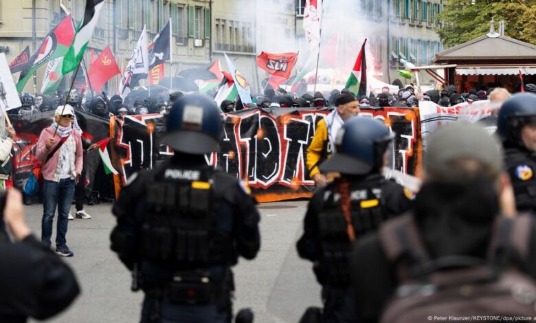 خلال تظاهرة مؤيدة للفلسطينيين في العاصمة السويسرية برن نهاية هذا الأسبوع، اندلعت اشتباكات عنيفة أسفرت عن إصابة 18 من عناصرها واثنين من المتظاهرين، وتسببت بأضرار جسيمة بالممتلكات، بحسب الشرطة السويسرية اليوم الأحد (12 أكتوبر/ تشرين الأول 2025).
