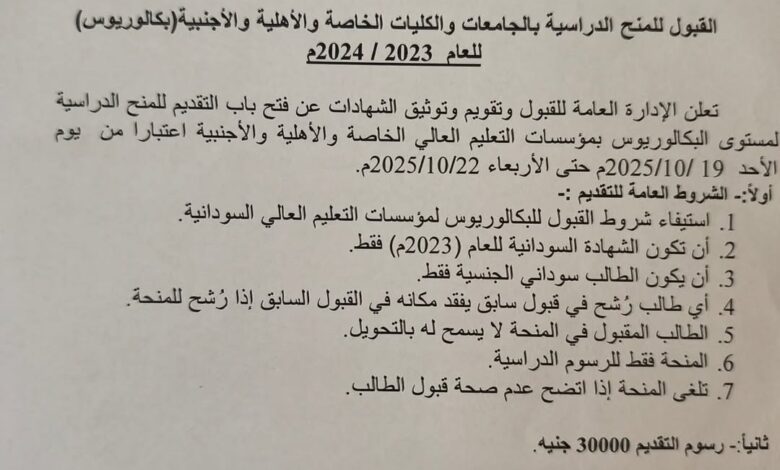 وشددت الإدارة على أن المنحة تلغى فوراً إذا تبين عدم صحة قبول الطالب أو وجود أي بيانات غير صحيحة، مضيفة أن رسوم التقديم حددت بمبلغ 30,000 جنيه سوداني، داعية الطلاب الراغبين إلى الإسراع في استكمال إجراءاتهم عبر الموقع الإلكتروني الرسمي للإدارة العامة للقبول على الرابط: www.admission.gov.sd