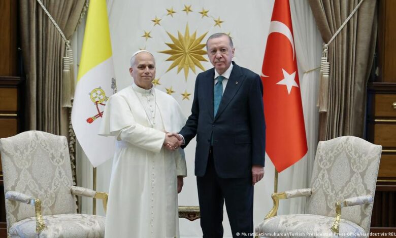وأشاد الرئيس التركي أيضا بموقف البابا من القضية الفلسطينية، داعيا إلى “العدالة” للشعب الفلسطيني وتطبيق حل الدولتين “بأسرع وقت ممكن”.