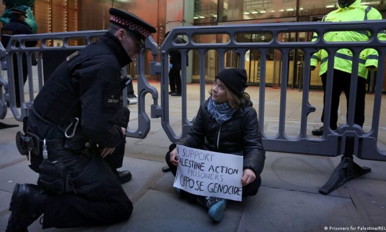 وكانت شرطة لندن قد أعلنت عن توقيف “شابة في الثانية والعشرين من العمر رفعت” لافتة “دعما لمنظمة محظورة”، والمقصود هنا هو مجموعة “بالستاين أكشن” (Palestine Action)، من دون ذكر اسم الشابة. وانتشرت على شبكات التواصل الاجتماعي صور لتونبرغ وهي جالسة على الأرض تحمل لافتتها.