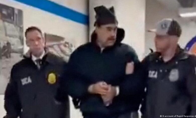 وأظهرت صور الرئيس الفنزويلي يترجل من طائرة برفقة عناصر الأمن في مطار في شمال نيويورك، ثم يصل إلى مانهاتن على متن مروحية. وفي وقت لاحق، نشر البيت الأبيض مقطع فيديو لمادورو، مكبل اليدين ومنتعلا صندلا، ويقتاده عناصر أمن إلى مكاتب الوكالة الفدرالية لمكافحة المخدرات.