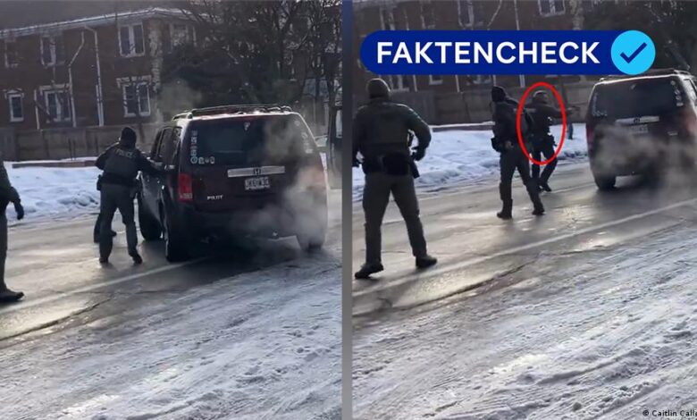 في بداية الفيديو تظهر سيارة دفع رباعي بلون بوردو من طراز هوندا بايلوت متوقفة بشكل عرضي على طريق مغطى بالثلج. تمكن فريق التحقق في DW من تحديد موقع الحادث بالضبط وهو شارع بورتلاند في مينيابوليس بالقرب من رقم 3328.
